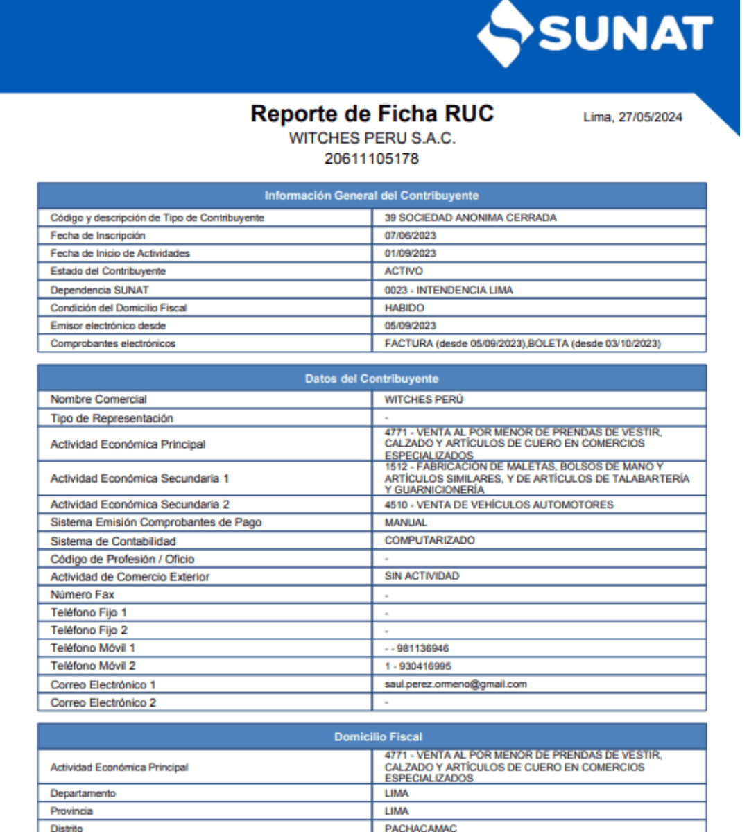 Somos Witches calzados Peru S.A.C "la tienda de calzados en cuero peruano más grande del Perú" dedicados a la venta de calzados en cuero de nuestra propia marca y demás marcas nacionales, comprometidos en entregar calzados de calidad y una atención personalizada. Contamos con 10 años en el rubro, enviando miles de calzados a todo el Perú. Cada uno de nuestros calzados cuentan con garantía total. Registrados en la sunat e indecopi de manera formal.